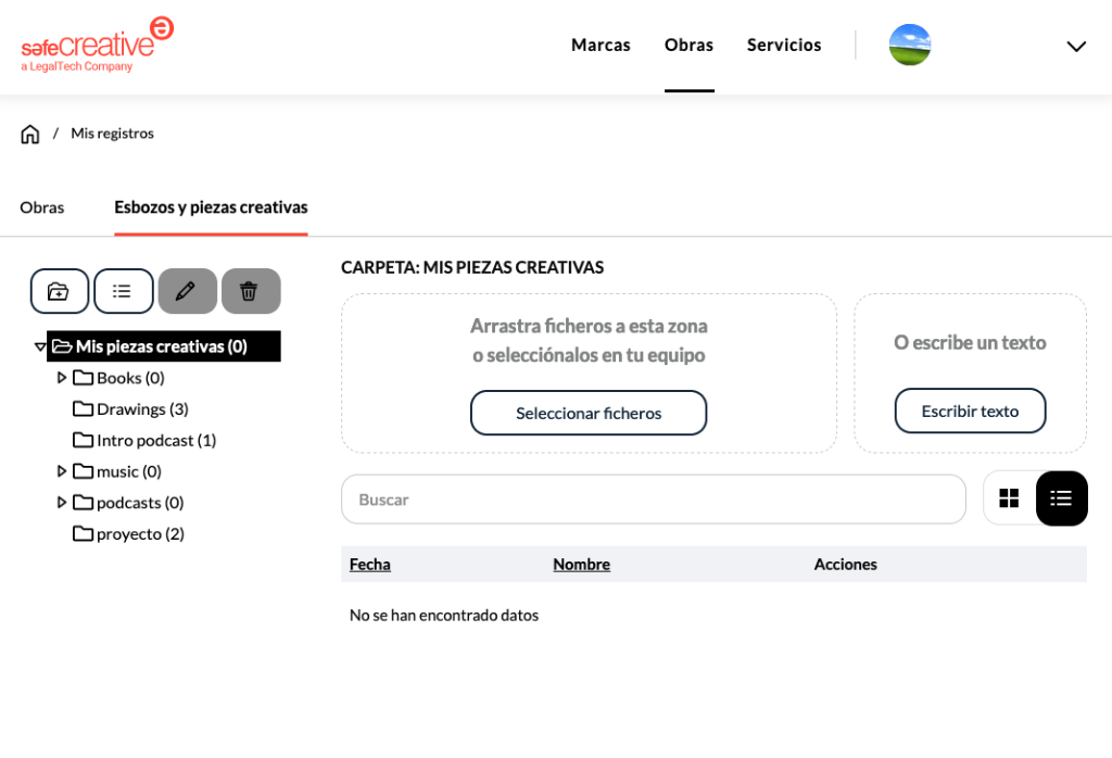 - Espacio para subir o crear ficheros: Una vez que selecciona una carpeta, encontrará un espacio específico para subir ficheros de su proceso creativo. Además, podrá escribir y guardar textos directamente en la plataforma, como notas, ideas o bocetos, que quedarán registrados como parte del proceso.