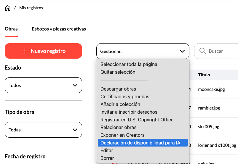 Es en este punto donde desde ahora ya se puede informar, en cada registro de Safe Creative, o en todos de una vez, el deseo del autor en lo relativo a que sus obras puedan ser usadas, o no, por empresas de IA generativa para entrenar sus modelos.