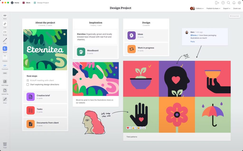 Una de las características más valiosas de Milanote es su capacidad para integrar recursos de diferentes fuentes, como Google Drive, Dropbox y Unsplash. Esto facilita la creación de moodboards, mapas visuales y esquemas complejos. Además, su funcionalidad colaborativa permite compartir tableros con compañeros y clientes con el fin de recibir comentarios.