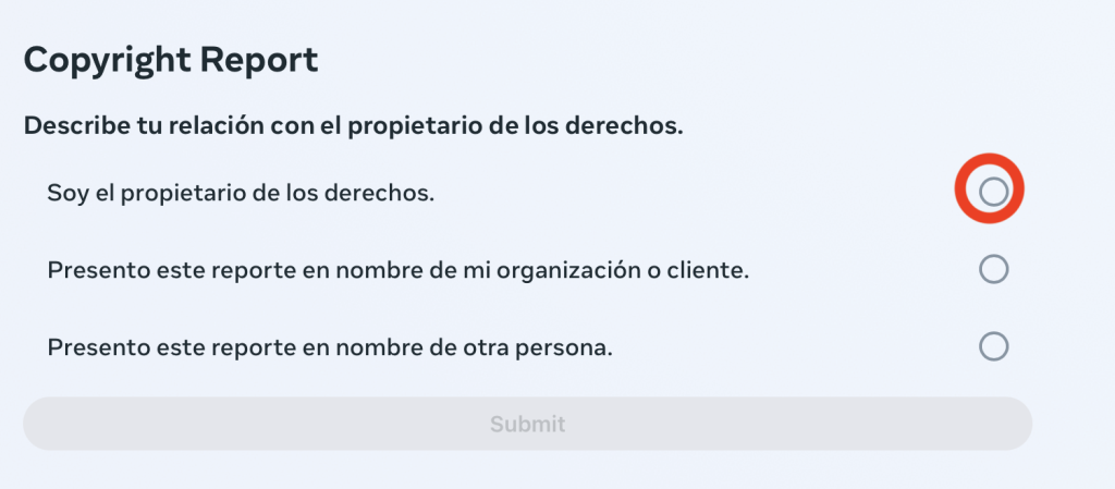Llenando este formulario en Instagram. Parece sencillo, pero tiene algunos trucos, así que te diré aquellas preguntas en las que debes abrir un poco más los ojos y atender bien lo que escribirás. Lo primero es indicar que eres el propietario de esos derechos, ya que solamente el propietario podrá hacer la reclamación, o máximo, que representes a alguien porque es tu cliente o representado.