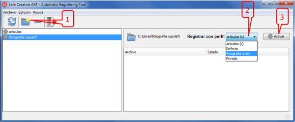 3.- De vuelta en ART selecciona la carpeta o carpetas cuyo contenido se registrará automáticamente en Safe Creative (1) – Indica para cada carpeta con qué perfil de registro se registrarán las obras de esa carpeta (2) – Puedes activar o desactivar el registro automático de cada una de las carpetas que hayas configurado (3).