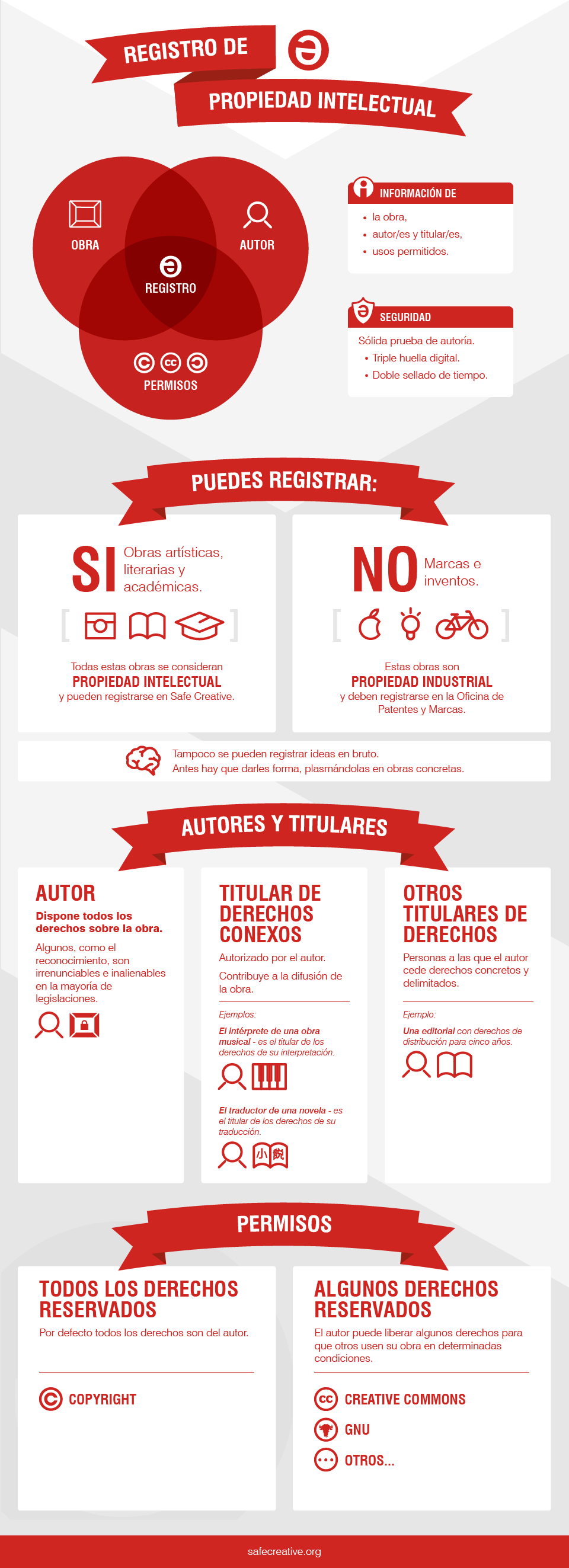 Qué es un registro de propiedad intelectual, para qué sirve, qué tipo de obras pueden registrarse en él, por quiénes, cómo… Sabemos que éstas son algunas de las primeras preguntas que surgen a los autores cuando se plantean registrar sus trabajos. Para poder aclararlas de la manera más clara y rápida posible, en esta infografía hemos sintetizado los conceptos básicos que hay que conocer: