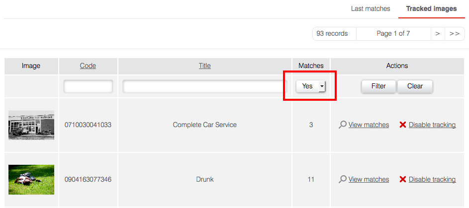 En Servicios > Seguimiento de imágenes podremos ver un listado con todas las coincidencias encontradas. En «Imágenes en seguimiento» pueden verse cuántas coincidencias ha detectado de cada imagen. Podemos aplicar filtros, para ver sólo aquellas que tienen coincidencias, filtrar por código de obra o título…