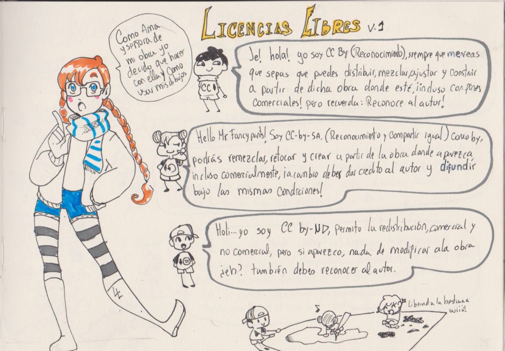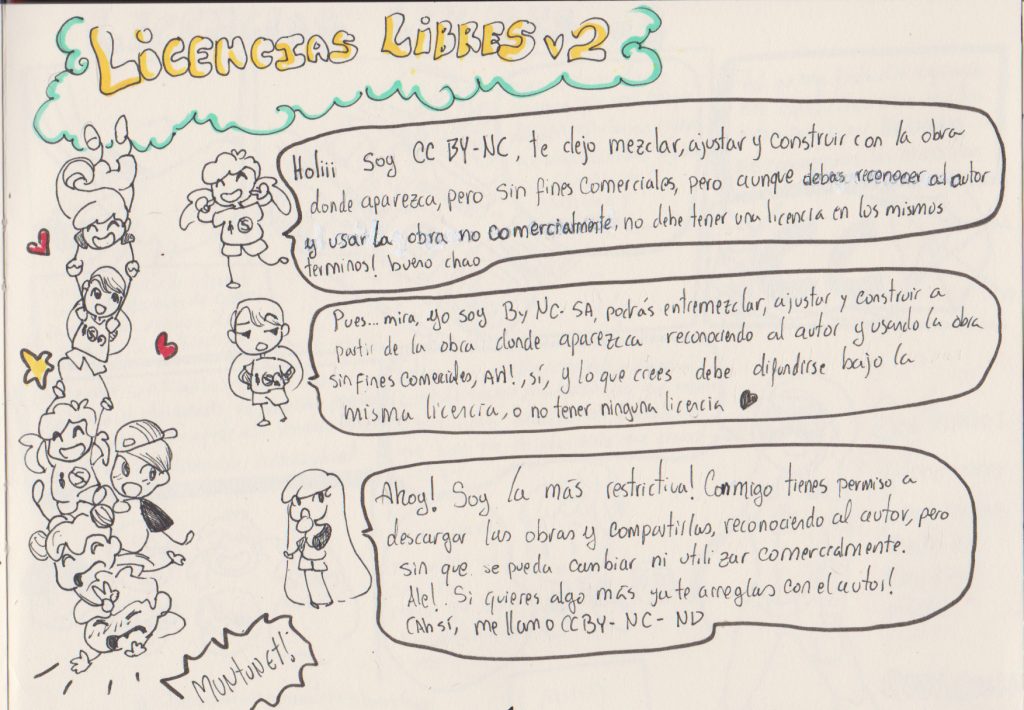 CC BY-NC-SA: Pues… mira, yo soy BY NC-SA. Podrás entremezclar, ajustar y construir a partir de la obra donde aparezca reconociendo al autor y usando la obra sin fines comerciales. ¡Ah! Sí, y lo que crees debe difundirse bajo la misma licencia, o no tener ninguna licencia.