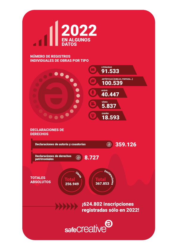 Pero, y en general ¿cuántas obras se registraron durante 2022 en Safe Creative? ¿De qué tipo fueron las que más se inscribieron? ¿Cuáles son los números detrás del registro tecnológico líder mundial?