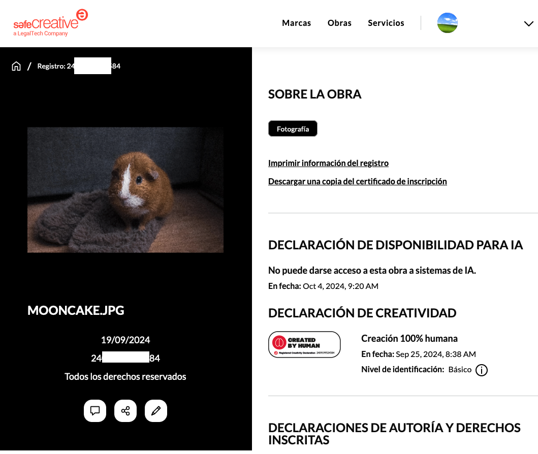 Es en este punto donde desde ahora ya se puede informar, en cada registro de Safe Creative, o en todos de una vez, el deseo del autor en lo relativo a que sus obras puedan ser usadas, o no, por empresas de IA generativa para entrenar sus modelos.