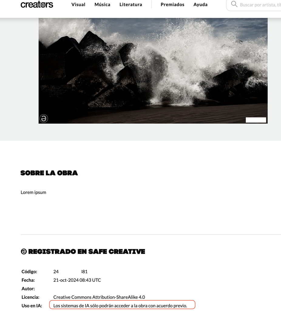 Hace meses que estamos trabajando en adaptar la plataforma de Creators, para la exposición de perfiles de creadores y sus mejores obras, según los comentarios recibidos. Es por eso que hemos añadido que la información expresada en las obras registradas en Safe Creative, también sea visible en Creators. De esta manera, Creators añade una capa más de seguridad para exponer las obras según el deseo de los artistas en función de sus preferencias en lo relativo a las IA generativas.