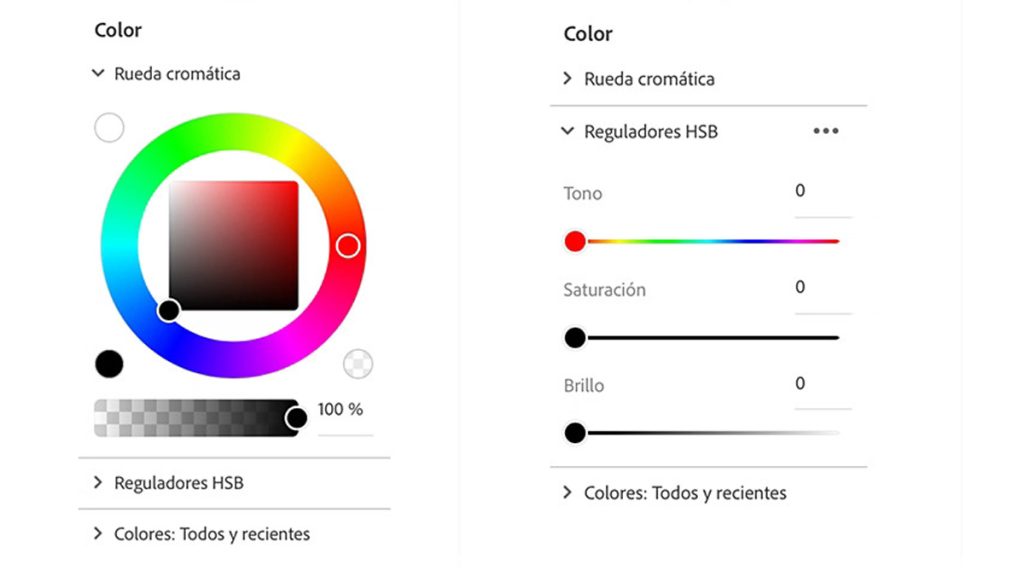Aquí es donde podremos ajustar y gestionar los colores para nuestro diseño. Con el panel abierto, llega el momento de elegir los colores que conformarán la paleta de nuestra obra. Adobe Fresco permite distintos modos de selección, como la rueda cromática o los reguladores RGB y HSB. La aplicación también incluye la herramienta cuentagotas que permite extraer colores directamente del dibujo, esta función la podremos encontrar en la misma barra de herramientas del lateral izquierdo desde donde podremos acceder rápidamente a esta función.