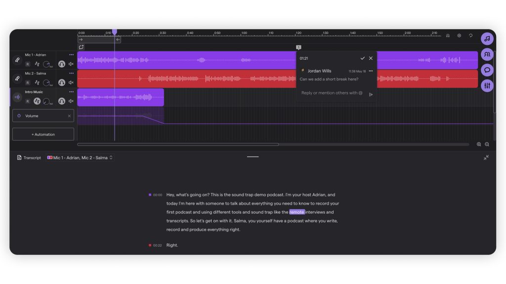 Como editor de audio, Soundtrap es perfecto para los arreglos y composición musical pero también es una gran herramienta para pódcasters. Desde el mismo programa se puede grabar, transcribir y editar el pódcast sin necesidad de otras aplicaciones. Soundtrap permite crear desde la sintonía para el pódcast, produciéndola en la misma plataforma. También permite colaborar a distancia con otros presentadores o invitados durante la grabación del pódcast con audio de buena calidad en varias pistas. Esta es la única herramienta del mercado que permite publicar los episodios del pódcast y sus transcripciones directamente a Spotify, una opción solo disponible dentro del plan Vocals & Songwriting.