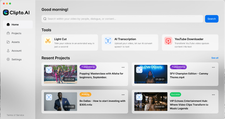 Clipto AI es una plataforma de transcripción impulsada por inteligencia artificial que convierte audio y video en texto con una gran precisión, tanto en español como en otros idiomas. Su tecnología identifica automáticamente a los hablantes, ideal para entrevistas y reuniones, y permite a los usuarios editar y corregir el texto en una interfaz muy sencilla. Además, su precisión es tal que detecta, incluso, las pausas, añadiendo en el texto los signos de puntuación más adecuados. Clipto.AI incluye un editor en línea con herramientas de búsqueda y resaltado para facilitar la revisión, optimizando el proceso para quienes trabajan con grandes volúmenes de audio.