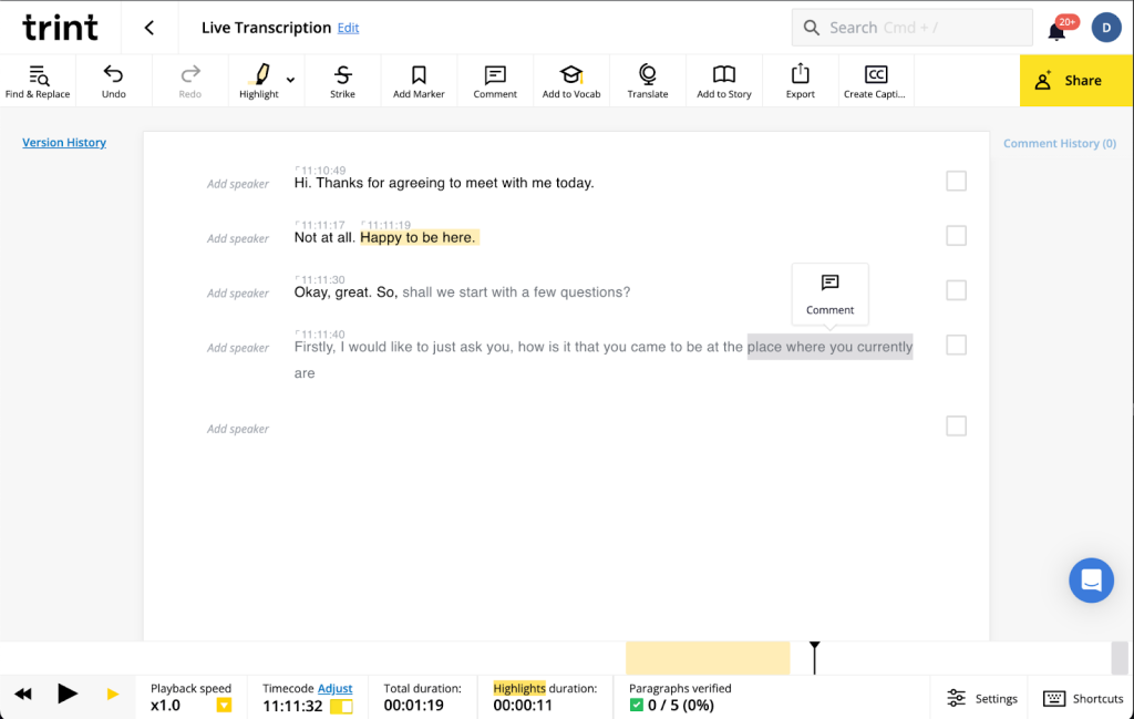 Trint es una plataforma de transcripción avanzada que utiliza inteligencia artificial para ofrecer una experiencia de transcripción y edición colaborativa. Su función de edición en equipo permite que varias personas puedan trabajar en una misma transcripción, lo cual es ideal para proyectos grandes o colaboraciones. Además, Trint permite añadir subtítulos a videos de manera sencilla y sincronizada, lo cual es ideal para creadores que necesitan que su contenido sea accesible para audiencias en redes sociales. Otra característica a destacar de Trint es la opción de construir historias. Se trata de una funcionalidad que permite a los usuarios seleccionar fragmentos de transcripciones y organizar textos en secuencias para crear narrativas y resúmenes.
