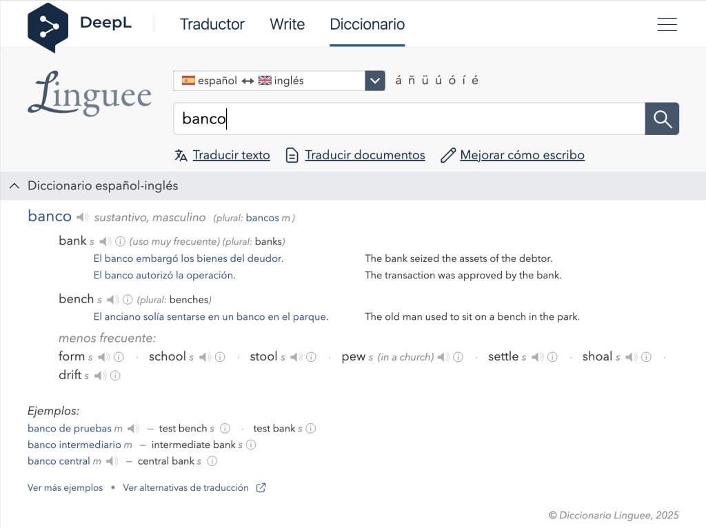En español, la palabra «banco» puede referirse a un asiento, a un conjunto de peces o a una entidad bancaria. Si esto ocurre en nuestra lengua, ¿cuántos significados nos estamos perdiendo en otras? De la misma compañía que la herramienta anterior es Linguee, un sitio web gratuito que combina un diccionario bilingüe con un buscador de traducciones. A pesar de su apariencia de diccionario convencional, dispone de una función fascinante. Linguee traduce palabras, textos y expresiones, pero los resultados que devuelve no se ciñen únicamente al sentido literal, sino que propone todo tipo de matices y usos reales de esa palabra en distintos contextos, una información de gran utilidad. El propósito de Linguee es claro: ayudar al usuario a identificar el uso correcto de una palabra de acuerdo al contexto.