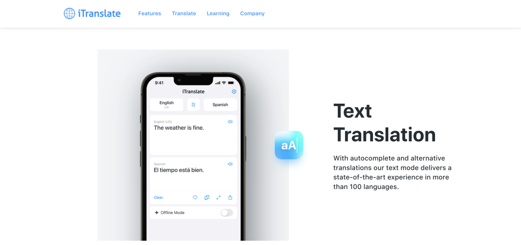 iTranslate proporciona su traducción en el idioma deseado al momento. Además, dispone de un modo offline que permite el uso de la aplicación sin conexión. iTranslate permite el uso de su traductor desde su aplicación web, accesible desde cualquier navegador, pero también dispone de una extensión para el teclado gracias a la que obtener traducciones inmediatas directamente en tu aplicación de mensajería favorita. iTranslate está disponible para iOS, Android, macOS y watchOS