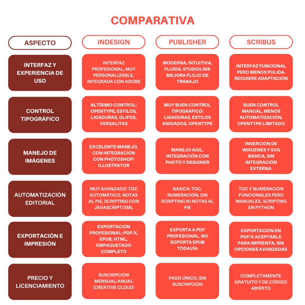 Publisher también es muy competente en cuanto a tipografía, cuenta con estilos anidados, ligaduras, columnas, justificación y buen soporte OpenType. Aunque no llega al nivel de automatización y refinamiento de InDesign. Finalmente, Scribus también ofrece un buen control tipográfico. Permite estilos, ligaduras, interletraje y otras funciones, aunque algunas requieren configuraciones manuales más tediosas.