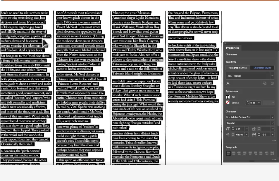 Aquí también tenemos a un claro vencedor. InDesign cuenta con un tratamiento tipográfico casi inmejorable. La herramienta permite a los usuarios gestionar estilos de carácter y párrafo con muchísima flexibilidad. Además, también soporta OpenType en profundidad y ofrece funciones como ligaduras automáticas, control de viudas y huérfanas, espaciado óptico y glifos personalizados.