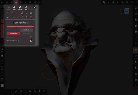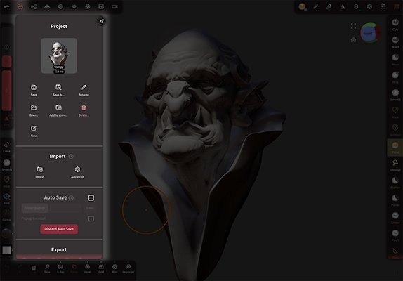 En Nomad Sculpt, un nuevo proyecto comienza con una esfera en la pantalla. Basta con simplemente arrastrar el lápiz sobre ella para arrancar la laboriosa tarea de esculpir. El programa activa por defecto la simetría para facilitar el proceso, aunque esta función puede desactivarse si se prefiere trabajar de forma más libre y orgánica. El programa incluye una generosa variedad de herramientas. De manera predeterminada, Nomad Sculpt trabaja con Clay, una función que añade material a la superficie como si se estuviera modelando con arcilla real. Además, la aplicación permite trabajar la figura con Crease, a partir de hendiduras en la figura, Trim, recortando la pieza, Smooth, para suavizarla o Mask (enmascarado). Estas herramientas son personalizables: es posible ajustar texturas, grados de presión, y más variables que se adaptan a las necesidades de cada proyecto y permiten una gran libertad creativa, tanto para trabajar con formas abstractas como para lograr resultados con más detalles en figuras anatómicas.