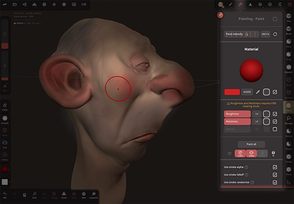 En Nomad Sculpt no todo va de esculpir: también se pueden colorear las figuras y pintar directamente sobre ellas. La app permite controlar aspectos como la rugosidad de las superficies y también conseguir efectos metálicos si la pieza lo requiere. Para ver los resultados, Nomad Sculpt ofrece dos modos de renderizado: Matcap, un formato más simple, perfecto para previsualizaciones rápidas, o PBR (Physically-Based Rendering), un formato que ofrece más detalle y muestra cómo se comportaría la pieza en videojuegos, animaciones o tras la impresión 3D del proyecto.