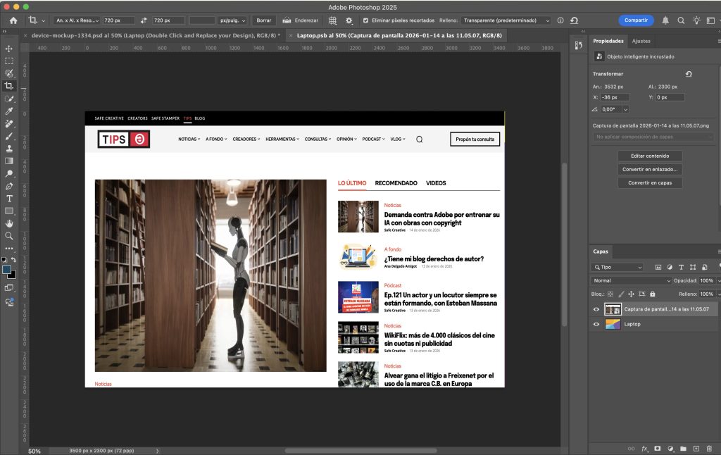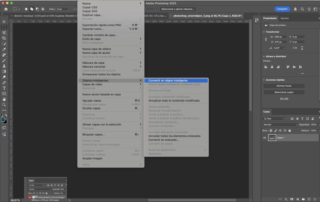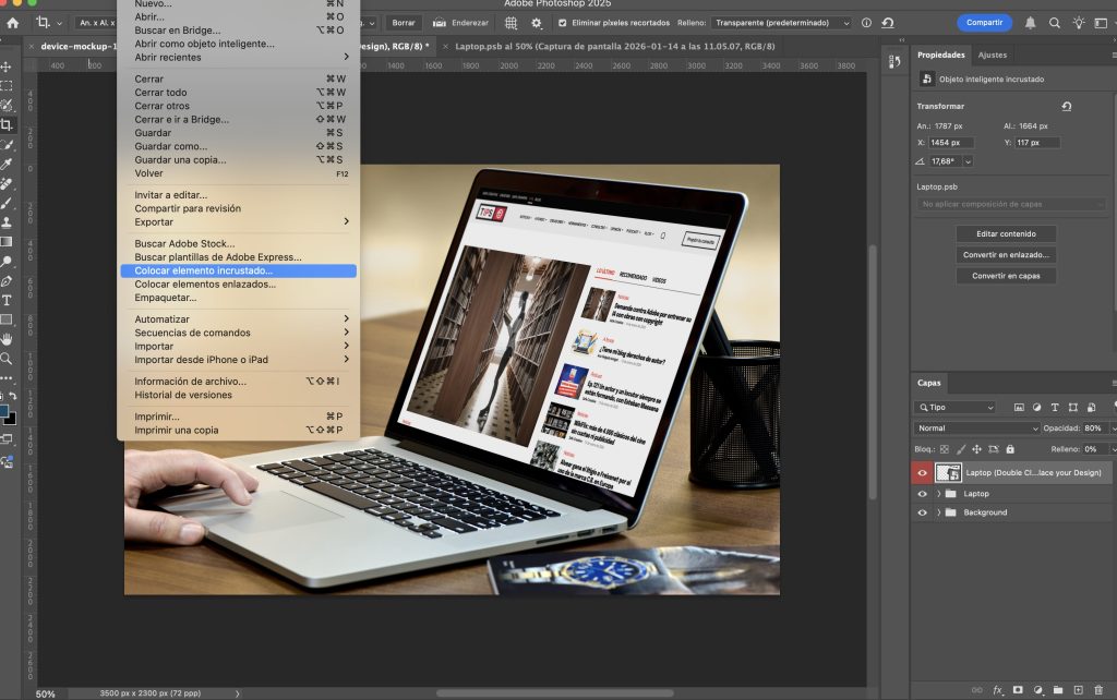 - Cuando trabajas con mockups, perspectivas o composiciones avanzadas, sustituir un elemento puede convertirse en una pesadilla. Con los Smart Objects, todo se vuelve más manejable: cambias un archivo, guardas y listo.